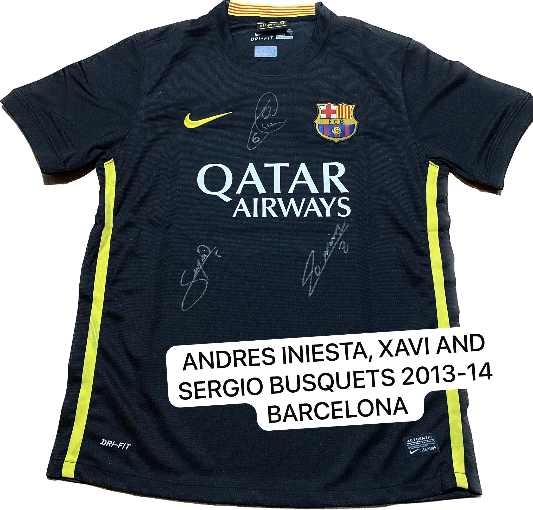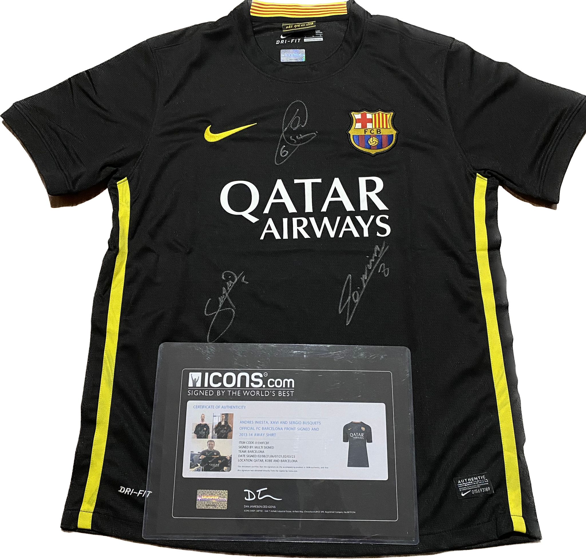 Andres Iniesta, Xavi , And Sergio Busquets Signed Barcelona Away 2013-2014 Jersey ICONS COA